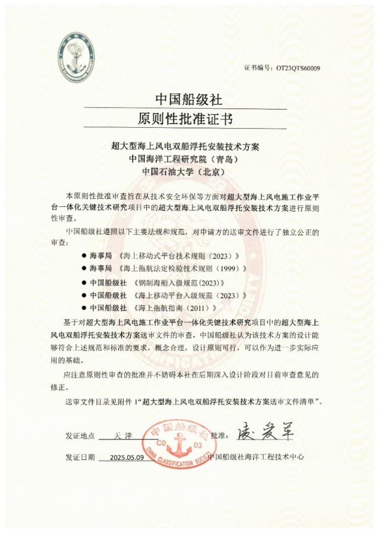 该技术方案为海上超大型风电提供了双船浮托安装方法,设计了海上风电专用的浮托安装作业程序,并完成了关键技术装备的概念设计和试验验证。中国船级社依照《海上移动式平台技术规则(2023)》等规范进行了独立公正的审查,认为该技术方案的设计能够符合相关规范和标准的要求,概念合理,设计原则可行,可以作为进一步实际应用的基础,决定授予原则性批准证书。