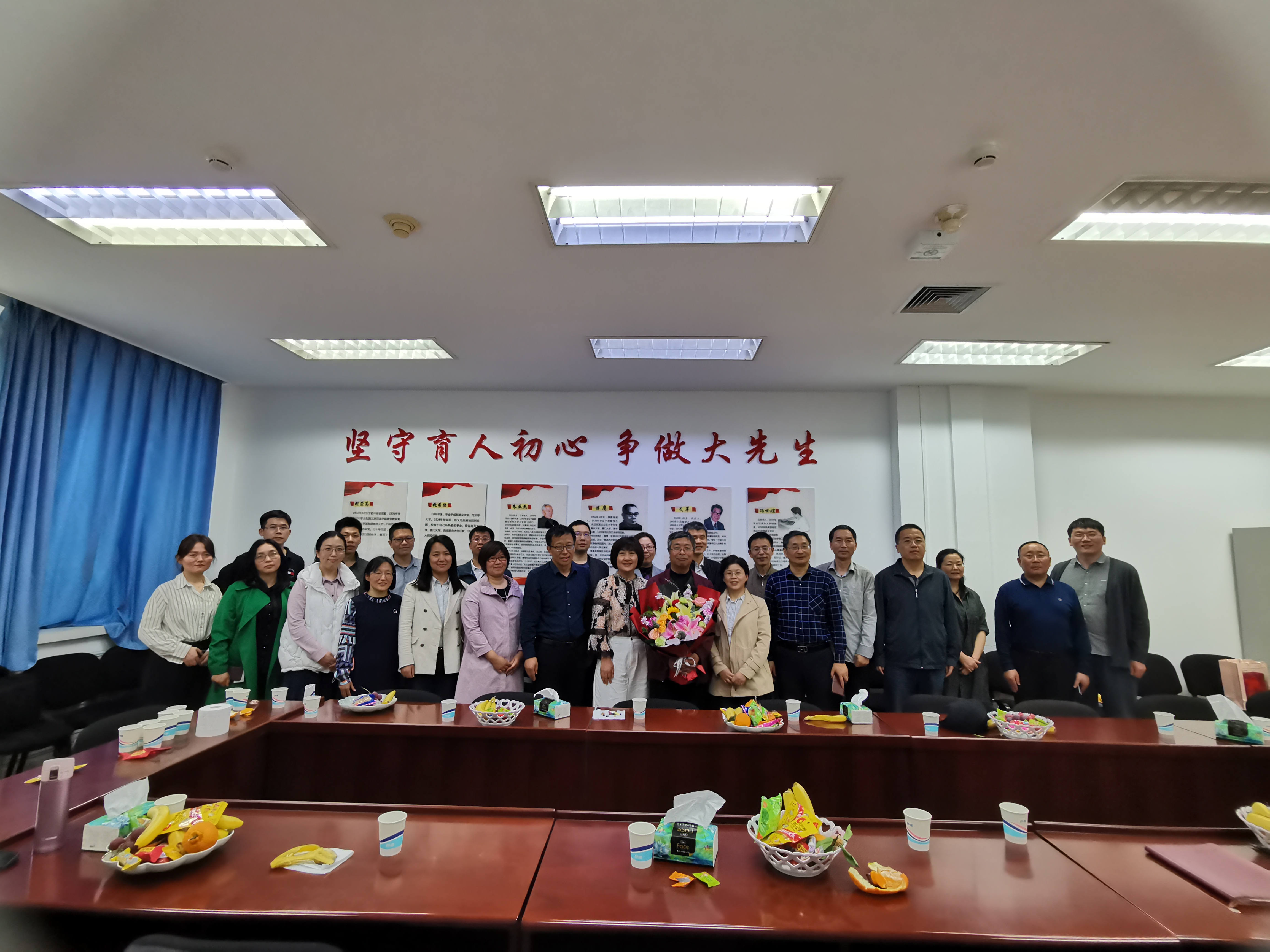 仪式上,学院领导为卢贵武教授送上鲜花和纪念品并合影留念。