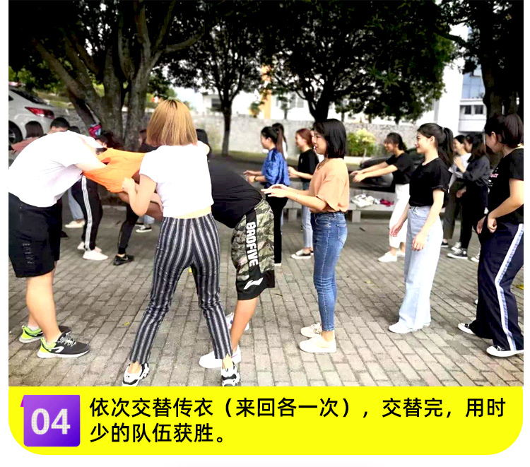 各学院以10名女生为单位站成一排,T恤穿在第一位队员身上做好准备,每组挑选一名队员辅助穿脱衣。双手手臂伸直,搭在对方手臂上,依次交替穿衣(来回各一次)交替完用时少的队伍获胜。