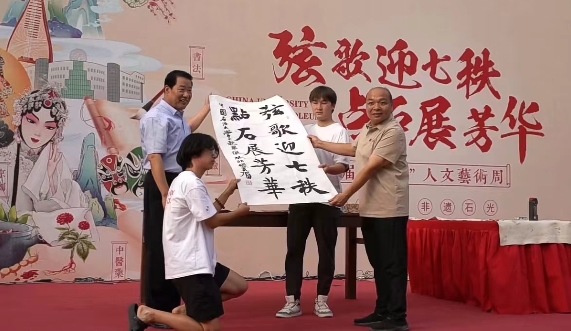 “我在现场与书法家共同书写了“芳华守艺,非遗石光”,希望通过笔墨传承中华优秀传统文化,表达对母校七十岁生日的祝福!”