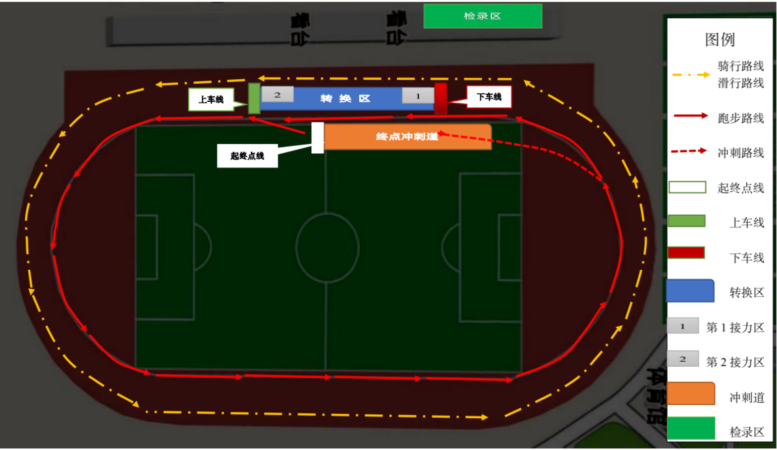 2. 下车线为转换区附近赛道上红色横条标志线,运动员须提前减速,在下车线之前下车,且一只脚在下车线前与地面接触一次,推车至转换区,否则,将处以警告并纠正或10秒时间处罚。