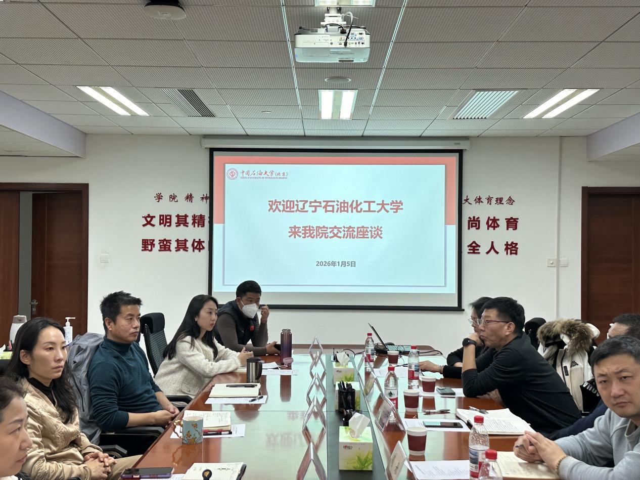 2026年1月5日,辽宁石油化工大学体育学院党总支书记崔松峰、院长刘欣、副院长南海艳、群体竞赛中心主任朱峰、党政办公室主任魏来一行到访教育学院,双方围绕高校体育工作展开交流座谈。会议由教育学院院长唐亮主持,我院党委书记王茹出席,分管相关工作的负责人参加座谈并就有关情况进行了介绍交流。