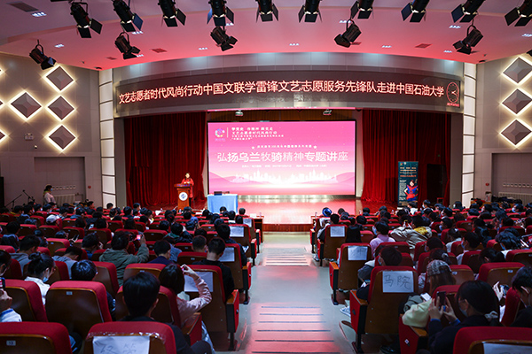 乌兰图雅生动讲述了乌兰牧骑的发展历史、优良传统,乌兰牧骑精神的内涵及时代价值。“瓦蓝蓝的天上飞雄鹰,我在高岗眺望北京……”,活动中,乌兰图雅深情演唱《站在草原望北京》《草原上升起不落的太阳》等歌曲,表达了少数民族热爱祖国、积极投身中国梦伟大事业的真挚情怀。中央音乐学院博士研究生、蒙古族马头琴演奏者诺敏的现场伴奏,让现场师生近距离感受了蒙古族民族音乐的魅力。活动后,现场同学与乌兰图雅进行热情互动。活动在乌兰图雅与现场师生合唱校歌《我为祖国献石油》中落下帷幕。