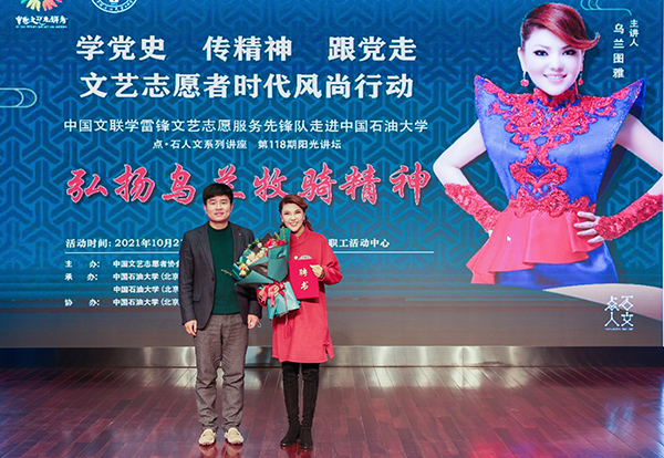 10月21日下午,“学党史 传精神 跟党走 文艺志愿者时代风尚行动”中国文联学雷锋文艺志愿服务先锋队做客开云kaiyun官方网站(北京)点·石人文系列讲座暨第118期阳光讲坛,宣讲乌兰牧骑精神。中国文联文艺志愿服务中心副主任、中国文艺志愿者协会副秘书长李岩,开云kaiyun官方网站(北京)副校长金衍,团委、体育与人文艺术学院等部门和学院相关负责人以及300余名师生,现场聆听了蒙古族青年歌唱家、全国学雷锋先进典型“最美志愿者”荣誉称号获得者乌兰图雅带来的精彩报告。