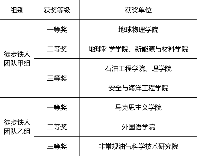 活动期间,来自学校15个学院(研究院)的同学们热情高涨,积极参与,其中参与人数、完成里程数最多的是地球科学学院,参与率最高的是马克思主义学院。最终,学校冬奥志愿者服务队获优胜团队奖;徐贵勤等16位同学获最佳徒步铁人奖;经济管理学院、化学工程与环境学院、机械与储运工程学院、信息科学与工程学院、人工智能学院、国际教育学院获徒步铁人团队优秀组织奖。