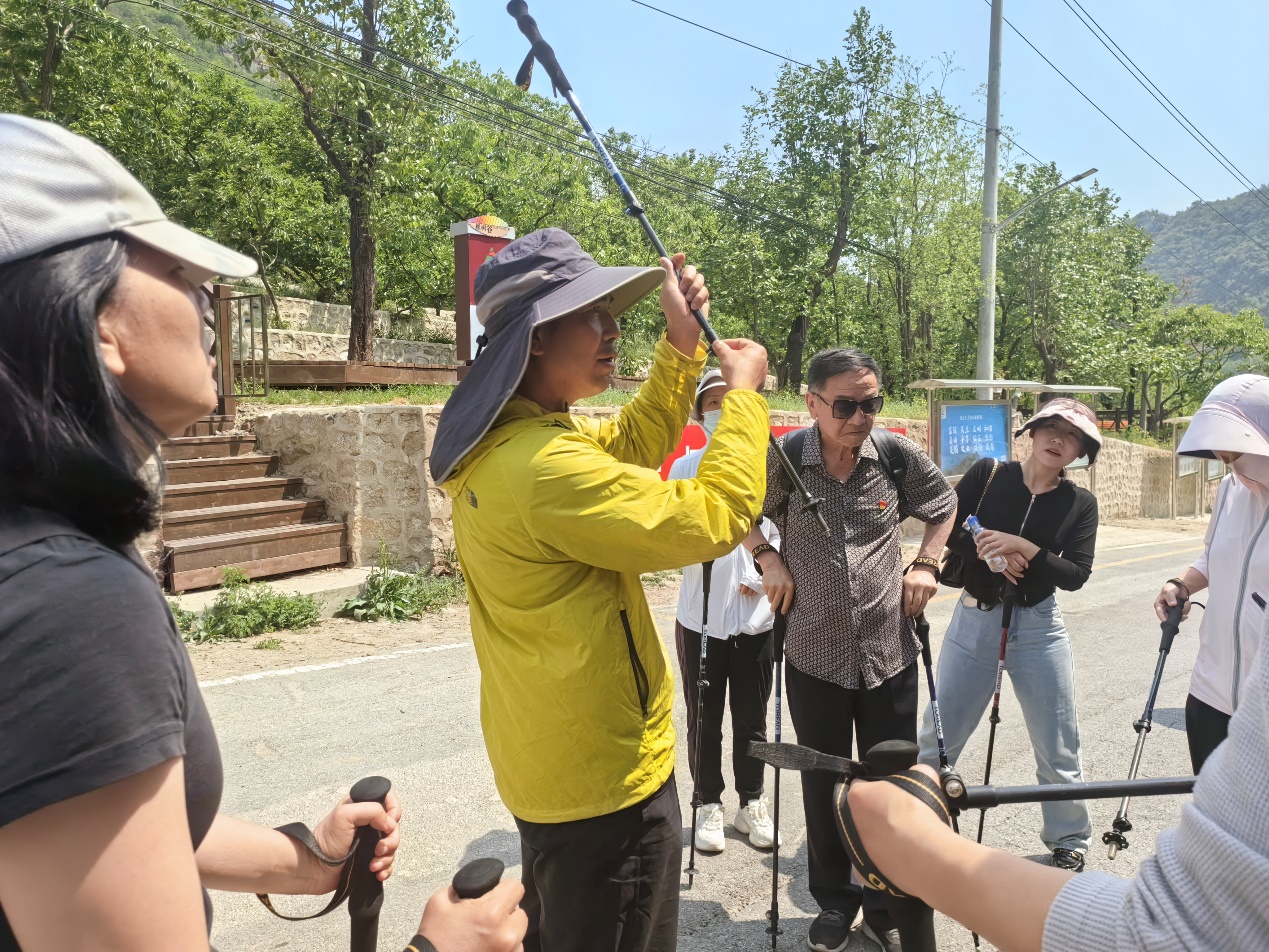 在活动开始前,野外生存课教师侍晓明向学院教师展示了登山杖的使用方式,帮助学院教师熟悉登山杖的构造和使用技巧,从而降低登山过程中体力消耗。