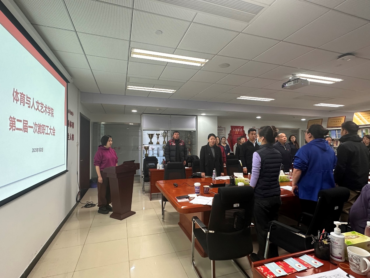 2025年1月2日上午,体育与人文艺术学院第二届第一次教职工大会在A922会议室举行。共有40名教职工参会。