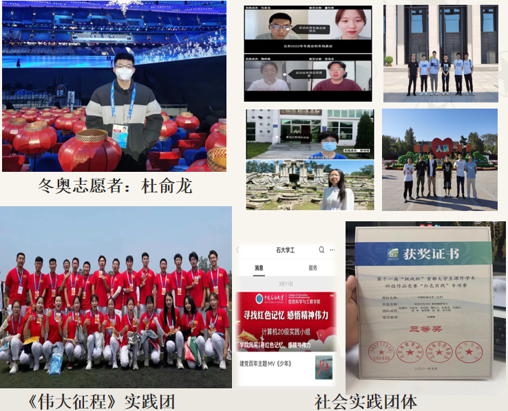 计算机20-3团支部积极参加志愿服务和社会实践。支部志愿服务、社会实践参与度达 100%。其中,魏文江、李文瑄参加建党百年活动,杜俞龙参加冬奥会、冬残奥会志愿活动,魏文江、李文瑄获得校优秀志愿者一等奖。此外,支部收获社会实践优秀团队,优秀视频、先进个人等荣誉,支部在社会实践方面曾获得“挑战杯”北京市三等奖。