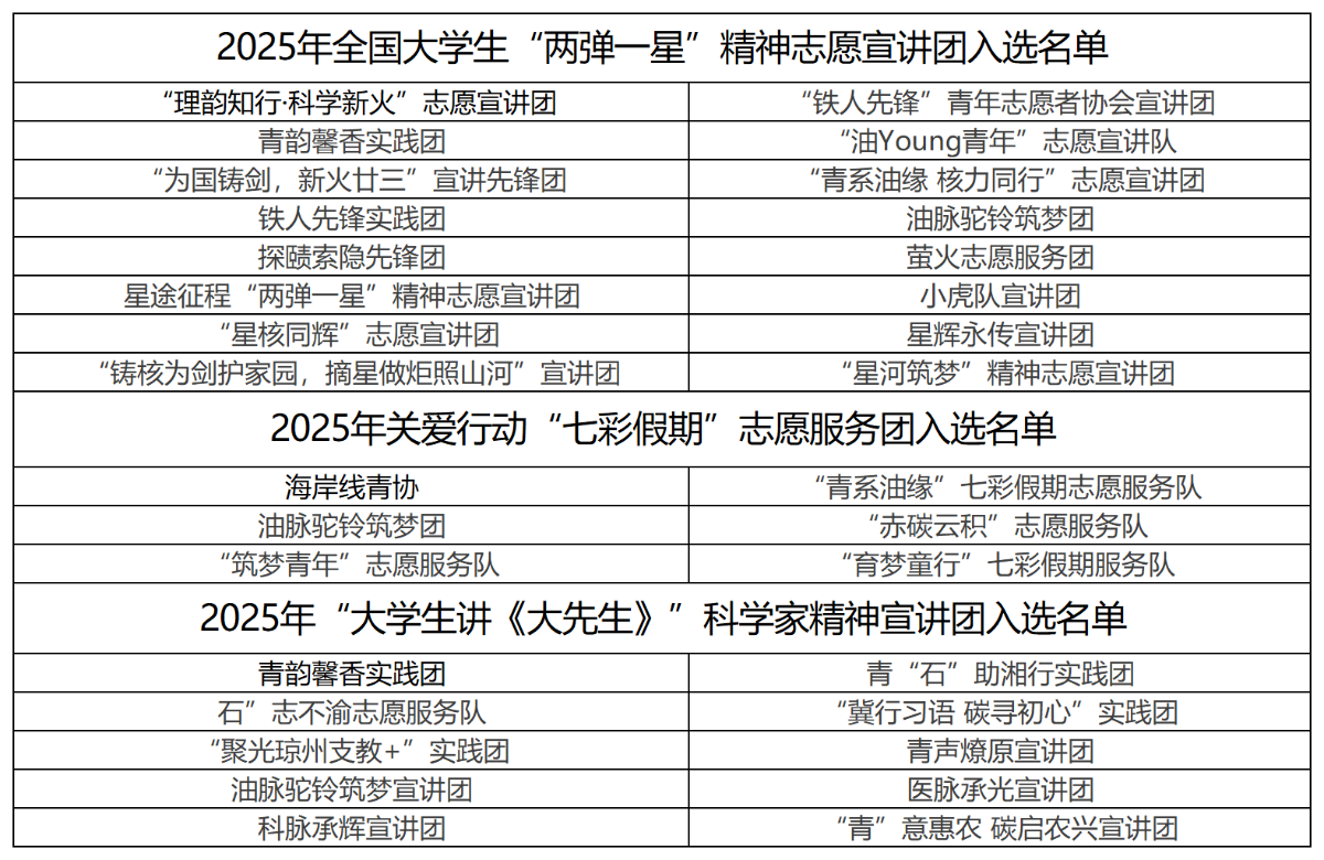 2025年全国大学生“两弹一星”精神志愿宣讲活动由团中央青年志愿者行动指导中心与中国核工业集团有限公司联合开展,旨在引导新时代广大青年学生坚定爱国报国信念,大力弘扬与传承“两弹一星”精神,激发广大青年投身强核强国事业的热情。2025年关爱行动“七彩假期”志愿服务活动由团中央青年志愿者行动指导中心、中国青年志愿者协会秘书处联合开展,组织动员青年志愿者以实际行动投身中国式现代化建设,切实加强对困境儿童、流动儿童、留守儿童、新兴领域群体未成年子女等少年儿童群体的关心关爱。