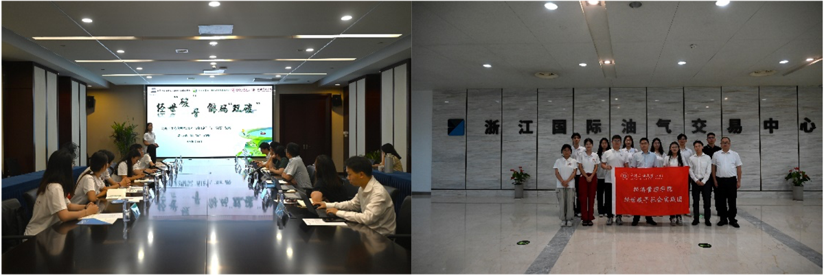 实践团来到浙江国际油气交易中心开展研学。座谈会上,浙油中心副总经理汪如朗和人力资源部总监、党群工作部部长杨军杰向同学们介绍了公司概况、业务板块等,以及浙油中心“一市场三中心五大平台”的整体布局。实践团向校友们介绍了学校努力为绿色发展的落实贡献力量的举措,得到校友们的一致肯定。