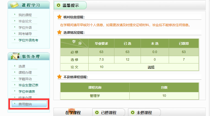 登录学生工作室,点击“费用缴纳”-“其他”-“补缴学费”,使用微信扫码进行交费。