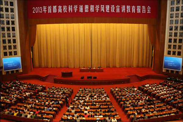 教育部部长助理林惠菁主持了会议,全国政协副主席、中国科协主席韩启德代表主办单位发表重要讲话,深刻阐述了加强科学道德和学风建设对实现中华民族伟大复兴中国梦的重要意义。报告会上,年近90岁的国家最高科技奖获得者、著名力学家、中国科学院院士、中国工程院院士郑哲敏先生,中国社科院近代史研究所研究员、中国史学会会长张海鹏先生,中国工程物理研究院研究员、国家能源专家咨询委员会副主任、国家气候变化专家委员会主任、中国工程院院士杜祥琬先生分别以《学知识、练本领、做诚实人》、《学习老一辈学者在治学与学风上的优秀品格》、《恪守底线、追求卓越——与青年朋友谈心》为题,为首都高校的研究生新生们作了精彩报告。